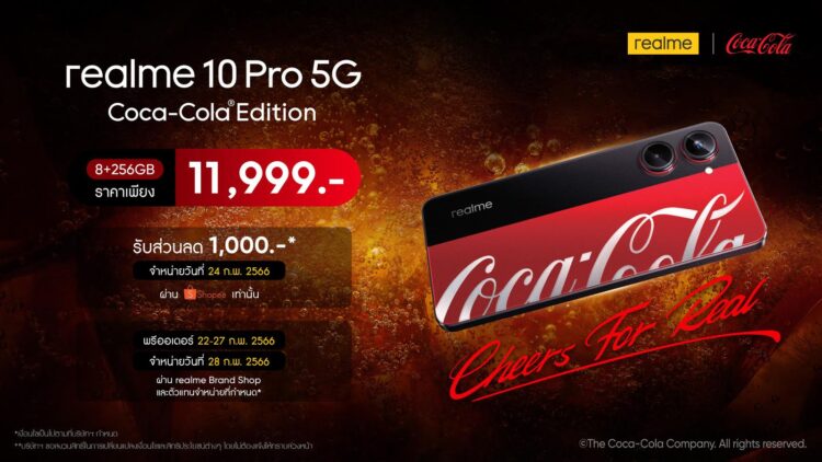 เรียลมี ประเทศไทย ประกาศวางจำหน่าย realme 10 Pro 5G Coca-Cola® Edition รุ่นความจุ 8/256GB ในราคา 11,999 บาท (จำหน่ายเฉพาะตัวเครื่องสมาร์ตโฟนเท่านั้น ไม่มี realmeow Coca-Cola เป็นของแถมหรือจำหน่ายแยก) ผ่านทางแพลตฟอร์มร้านค้าออนไลน์พันธมิตรชั้นนำอย่าง Shopee ในวันที่ 24 กุมภาพันธ์นี้เป็นวันแรก พร้อมมอบความคุ้มค่าอีกต่อสำหรับผู้ที่ซื้อ 100 ท่านแรก รับส่วนลดสูงสุดถึง 1,000 บาท โดย realme 10 Pro 5G Coca-Cola® Edition โดดเด่นด้วยดีไซน์ฝาหลังสุดเท่ของคู่สีแดง-สีดำสุดโฉบเฉี่ยว พร้อมโลโก้ Coca-Cola สีเงินสุดคลาสสิกที่ทุกคนหลงใหลในแถบสีแดงสด และไม่เพียงดีไซน์ภายนอก เพราะครั้งนี้เรียลมีจัดเต็มกับการ Customize หน้าตาของเฟิร์มแวร์ในเครื่องให้เป็นธีม Coca-Cola®ทั้งหมด ไม่ว่าจะเป็น UI ไอคอน หน้าจอล็อก และเอฟเฟกต์ระหว่างชาร์จไฟในธีมโค้กสีแดงและฟองน้ำอัดลม รวมถึงไฮไลต์สุดจี๊ดอย่างริงโทนของแบรนด์โค้กและเสียงซ่าของน้ำอัดลมที่สมจริง สำหรับแฟนโค้กที่ชอบถ่ายรูปจะต้องถูกใจกับ 80s Cola Filters ที่ให้ลุคแบบคลาสสิกจากยุค 1980 แถมยังมีเสียงกดชัตเตอร์สุดพิเศษเป็นเสียงเปิดกระป๋องโค้กอีกด้วย