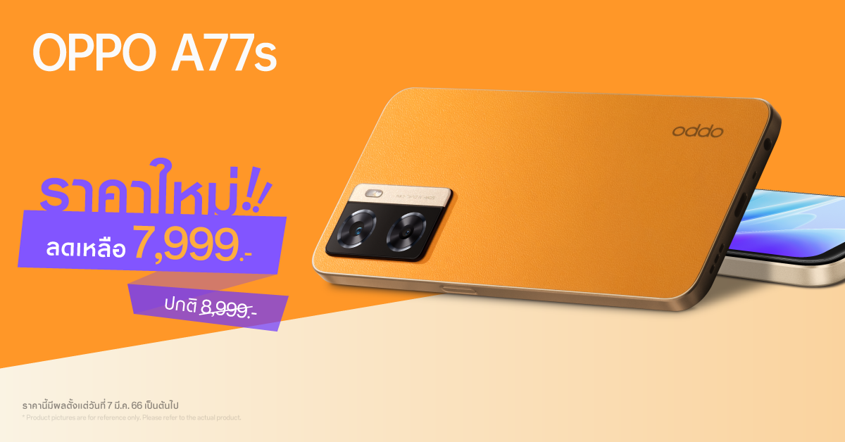 โดย OPPO  A77s มาในราคาใหม่เพียง 7,999 บาท สามารถเป็นเจ้าของได้แล้ววันนี้ ที่ OPPO Brand Shop และตัวแทนจำหน่ายทั่วประเทศ