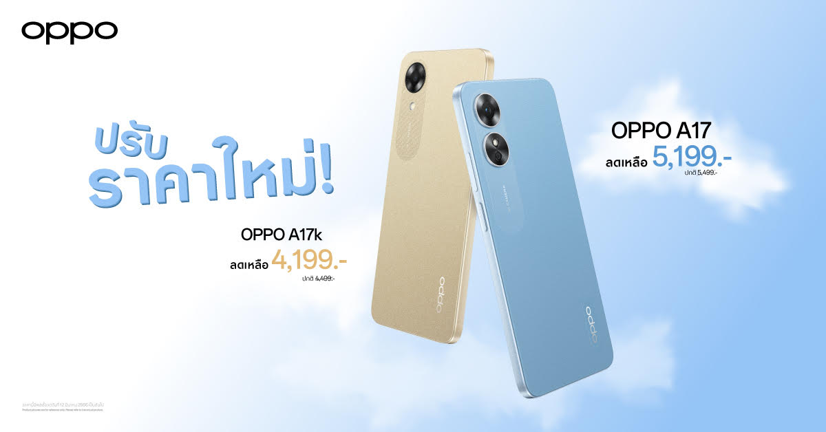 OPPO A17 และ OPPO A17k สมาร์ตโฟนพร้อมมอบประสบการณ์ใช้งานสุดคุ้มค่าแถมราคาโดนใจ มาพร้อมราคาใหม่สุดพิเศษ โดย OPPO A17 มาในราคา 5,199 บาท จากราคาปกติ 5,499 บาท และ OPPO A17k มาในราคา 4,199 บาท จากราคาปกติ 4,499 บาท ตั้งแต่วันที่ 12 มีนาคม 2566 เป็นต้นไป