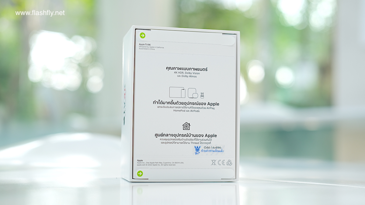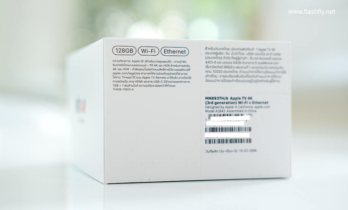 ข้างกล่องจะติดชื่อผลิตภัณฑ์ Apple TV 4K พร้อมกับชื่อรุ่น Wi-Fi หรือ Wi-Fi + Ethernet ส่วนด้านล่างจะบอกคุณสมบัติที่น่าสนใจของ Apple TV 4K รุ่นนี้เอาไว้