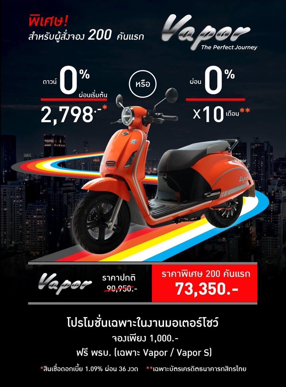 สัมผัสประสบการณ์ Intelligent Mobility และดูของจริงได้ในงาน Bangkok International Motor Show ครั้งที่ 44 ณ โซน MK1 – MK2 ชาเลนเจอร์ ฮอลล์ 1 อิมแพ็ค เมืองทองธานี ตั้งแต่วันที่ 22 มีนาคม – 2 เมษายน 2566 ที่มาพร้อมกับโปรโมชันเอาใจคนรักรถไฟฟ้า และสำหรับลูกค้าที่จองในงานนี้เท่านั้น รับข้อเสนอพิเศษมากมาย โดยรุ่น Vapor เปิดตัวในราคาพิเศษ 200 คันแรก ราคา 73,350 บาท จากราคาปกติ 90,950 บาท และ Vapor S รุ่น Limited Edition มีเพียง 99 คัน เท่านั้น คุ้มค่าในราคา 94,950 บาท จากราคาปกติ 125,500 บาท โดยทั้งสองรุ่นสามารถจองเพียง 1,000 บาท ผ่อน 0% นาน 10 เดือน (*เฉพาะบัตรเครดิตธนาคารกสิกรไทย) และดาวน์ 0%