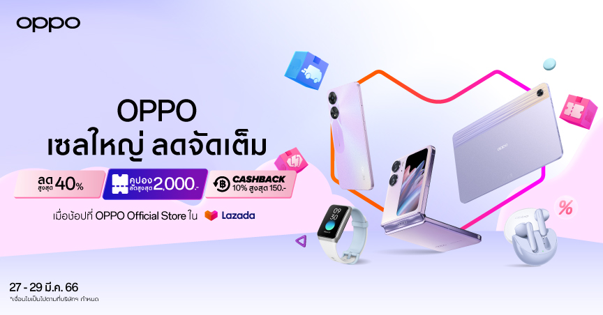 เตรียมตัวให้พร้อม! แล้วมาช้อปสมาร์ตโฟนและอุปกรณ์ IoT ในราคาลดจัดเต็ม พร้อมรับของสมนาคุณมากมายใน OPPO Grand Sale ตั้งแต่วันที่ 27 – 29 มีนาคม 2566 นี้ ที่ OPPO Official Store บน Lazada