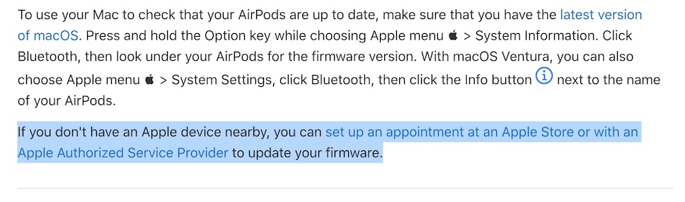 กรณีที่ผู้ใช้หูฟัง AirPods ไม่ได้อยู่ใกล้ iPhone, iPad, Mac หรือไม่มีอุปกรณ์เหล่านี้ Apple ระบุใหม่ในคู่มือว่า สามารถนัดหมายกับ Apple Store ที่อยู่ใกล้เคียง เพื่อขอเข้าไปรับการอัปเดตเฟิร์มแวร์ของหูฟังได้