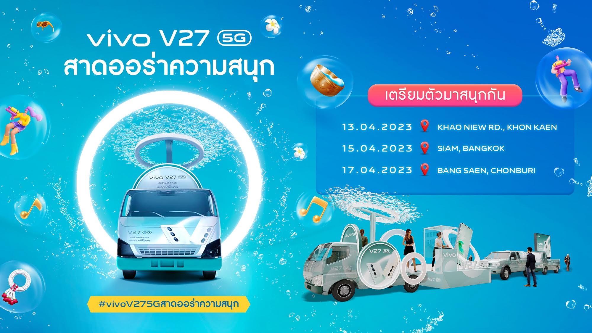 vivo แบรนด์สมาร์ตโฟนชั้นนำระดับโลก เตรียมสาดความสนุกต้อนรับเทศกาลสงกรานต์ในปีนี้กับแคมเปญสุดยิ่งใหญ่ ‘vivo V27 5G สาดออร่าความสนุก’ เอาใจสายคอนเทนต์ตัวจริงกับ V27 5G สมาร์ตโฟนรุ่นล่าสุดจากตระกูล V Series ที่ช่วยให้ภาพพอร์ตเทรตของทุกคนมีออร่ากว่าที่เคย เตรียมพบกับขบวนคาราวาน vivo V27 5G ที่จะขนความมันส์ไปสาดทุกคนให้ชุ่มฉ่ำได้สัมผัสกับความสุขกันทั่วทั้งประเทศ สนุกสนานไปกับบูธดีเจเคลื่อนที่ และกิจกรรมท้าให้ลองถ่ายภาพพอร์ตเทรตด้วย vivo V27 5G ตลอดทั้งวันไม่ว่าจะเป็นช่วงเวลากลางวันหรือกลางคืน จะแสงไหนก็เอาอยู่ พร้อมโพสต์ภาพและติดแฮชแท็ก #vivoV275Gสาดออร่าความสนุก เพื่อลุ้นรับรางวัลใหญ่สุดเซอร์ไพรส์จาก vivo แล้วมาพบกันกับ 3 พื้นที่สงกรานต์สุดฮิตทั่วไทยจัดเต็ม 3 วัน ให้แฟนๆ ได้สัมผัสประสบการณ์กันอย่างใกล้ชิดตลอดช่วงเทศกาลปีใหม่ไทยในปีนี้