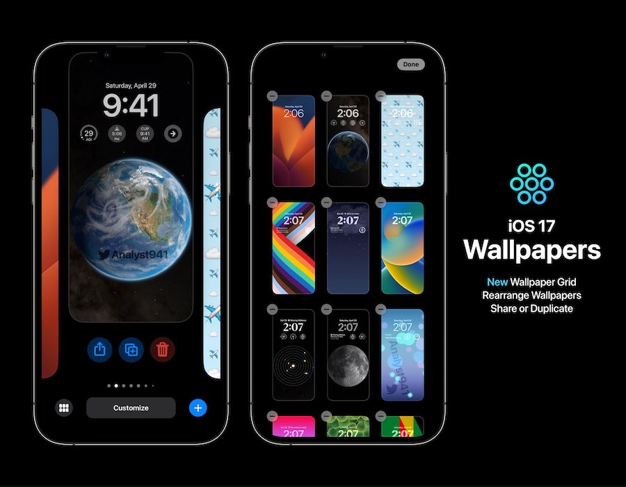 นอกจากนี้ iOS 17 ยังถูกลือว่าจะมีการยกเครื่องวิธีการปรับแต่งวอลเปเปอร์ใหม่ เริ่มจากมุมมองการแสดงวอลเปเปอร์ 9 ภาพ ในรูปแบบตาราง 3 x 3, สามารถลบวอลเปเปอร์ได้อย่างรวดเร็วในมุมมองตาราง จัดเรียงวอลเปเปอร์ใหม่ได้ง่ายขึ้นในมุมมองตาราง และสามารถแชร์วอลเปเปอร์ได้อย่างรวดเร็วเพียงปัดขึ้นแล้วแตะไอคอนแชร์
