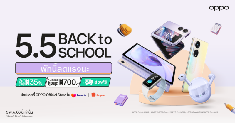 พลาดไม่ได้! 5.5 นี้เตรียมตัวให้พร้อม แล้วมาช้อปสมาร์ตโฟนและอุปกรณ์ IoT จาก OPPO ในราคาสุดพิเศษ พร้อมรับของสมนาคุณมากมายที่ OPPO 5.5 Back to school วันที่ 5 พฤษภาคม 2566 ที่ OPPO Official Store บน Shopee และ Lazada
