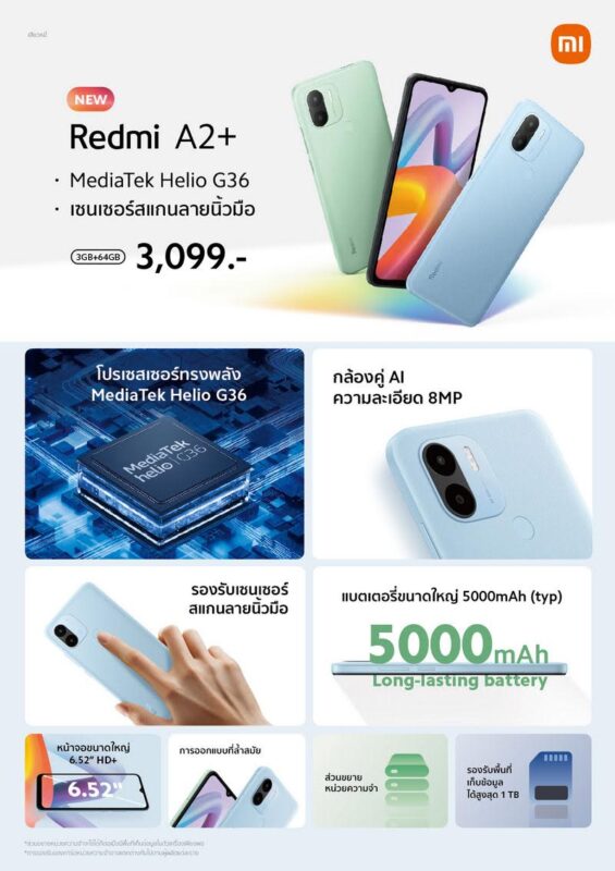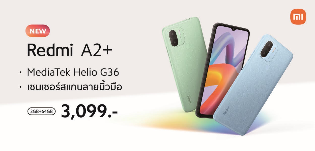 เสียวหมี่ ประเทศไทย ประกาศวางจำหน่าย Redmi A2+ (รุ่นความจุ 3GB+64GB) สมาร์ทโฟนราคาคุ้มค่าในราคาเพียง 3,099 บาท ขับเคลื่อนด้วยชิปเซ็ต MediaTek Helio G36 มาพร้อมกล้องคู่ AI ความละเอียด 8MP และแบตเตอรี่ขนาดใหญ่ 5000mAh (typ) ทั้งยังมีเซนเซอร์สแกนลายนิ้วมือ สามารถเป็นเจ้าของ Redmi A2+ ได้แล้ววันนี้ ที่ Xiaomi Store และร้านตัวแทนจำหน่ายที่ร่วมรายการทั่วประเทศ