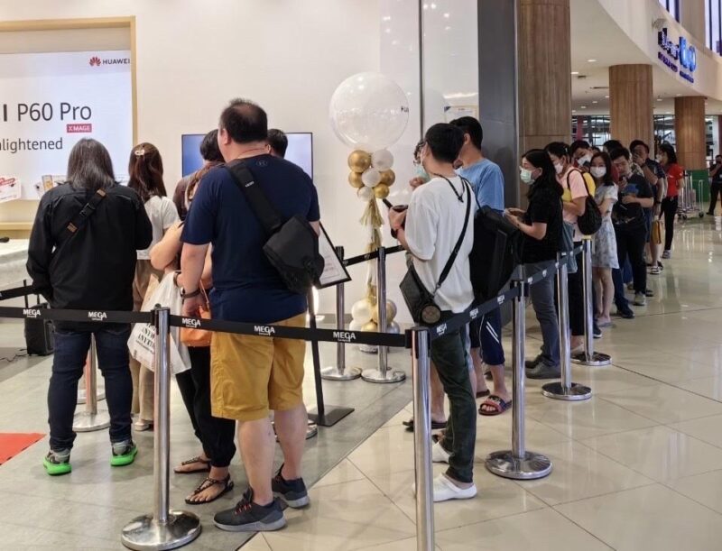 ภาพบรรยากาศ การต่อคิวรับเครื่อง HUAWEI P60 Pro ที่หน้า Huawei Experience Store  สาขา เมกาบางนา