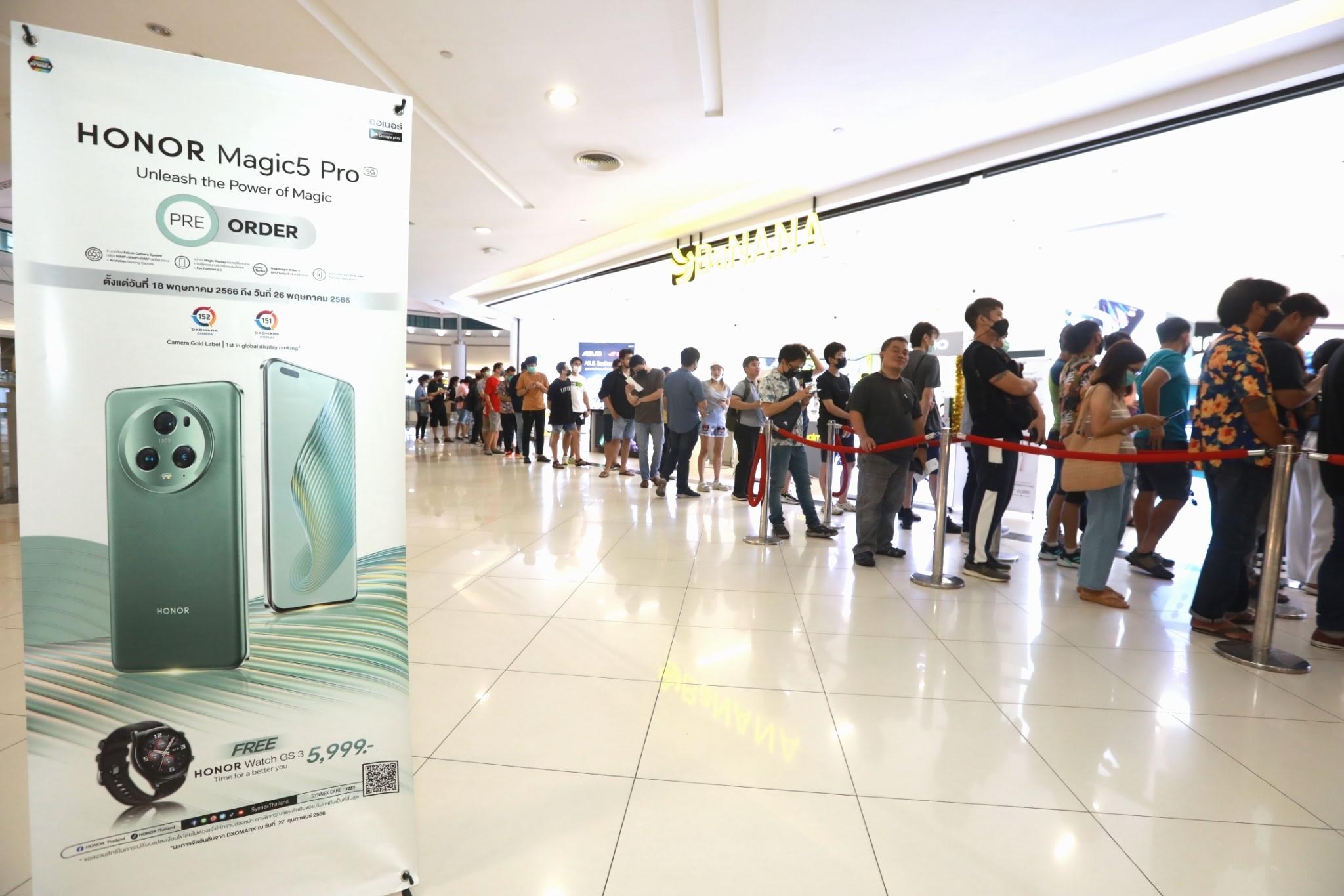 นอกจากนี้ HONOR ยังจัดเซอร์ไพรส์สุดเอ็กซ์คลูซีฟสำหรับแฟนๆ ที่มารับ HONOR Magic5 Pro 5G ในวันที่ 27 พฤษภาคม 2566 ที่เปิดจำหน่ายอย่างเป็นทางการ ณ หน้าร้านค้าตัวแทนจำหน่ายที่ร่วมรายการ โดยสำหรับลูกค้า 40 คิวแรกที่มารับเครื่องที่ BaNANA สาขาศูนย์การค้าแฟชั่นไอส์แลนด์ รวมถึงลูกค้า 30 คิวแรกที่มารับเครื่องที่ Jaymart สาขาศูนย์การค้าสยามพารากอน และ TG Fone สาขาศูนย์การค้าเซ็นทรัล พลาซ่า เวสต์เกต จะได้รับ HONOR Pad8 แท็บเล็ตรุ่นล่าสุดที่ครบครันด้วยฟีเจอร์ตอบโจทย์ทุกการใช้งานมูลค่ารวม 9,990 บาท ไปใช้คู่กันเพื่อเติมเต็มการใช้งานอุปกรณ์ของ HONOR ไปอีกขั้น โดยในวันแรกของการวางจำหน่าย มีแฟนๆ มาต่อแถวรอรับเครื่องอย่างหนาแน่น ตอกย้ำกระแสตอบรับที่ดีเหนือความคาดหมายสำหรับ HONOR Magic5 Pro 5G ซึ่งได้คาดว่าจะเป็นรุ่นที่จะมาเขย่าวงการสมาร์ทโฟนเรือธงในปีนี้