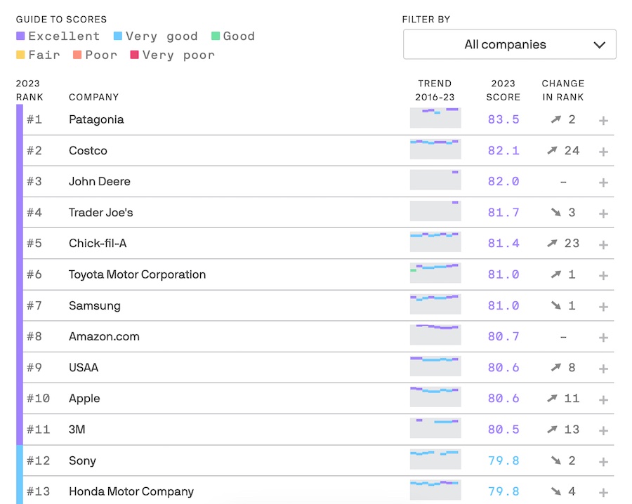 Harris Poll ขอให้กลุ่มตัวอย่างชาวอเมริกันจำนวนมาก เลือกชื่อแบรนด์ 2 แบรนด์ที่พวกเขาคิดว่ามีชื่อเสียงดีที่สุด และอีก 2 แบรนด์ที่พวกเขาคิดว่าแย่ที่สุด และผลสำรวจล่าสุดพบว่า Patagonia บริษัทเสื้อผ้าสำหรับกิจกรรมกลางแจ้ง เป็นแบรนด์ที่มีชื่อเสียงที่สุดในสหรัฐอเมริกา