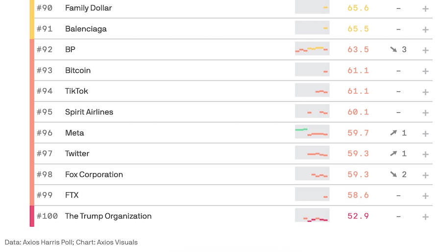 ขณะที่ Apple เลื่อนจากอันดับที่ 11 ในปีที่แล้ว ขึ้นมาอยู่ในอันดับที่ 10 บริษัทด้านครือข่ายสังคมออนไลน์อย่าง Meta และ Twitter ติดอยู่อันดับที่ 96 และ 97 ตามลำดับ