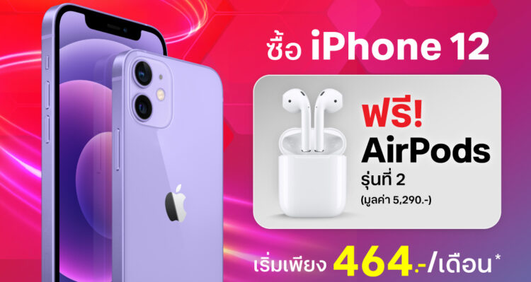 พบข้อเสนอที่สุดของความคุ้ม 1 แถม 1 …วันนี้ลูกค้าทรู 5G เป็นเจ้าของ iPhone 12 ได้ง่ายขึ้น ผ่อนเริ่มต้นเพียง 464 บาทต่อเดือน* (เมื่อสมัครพร้อมแพ็กเกจรายเดือน 5G Together 1,199 บาท สัญญา 18 เดือน) ไม่ต้องชำระค่าบริการล่วงหน้า พร้อมรับ AirPods รุ่นที่ 2 มูลค่า 5,290 บาทฟรีทันทีหลังการสมัครบริการตามเงื่อนไข* … รีบเลยของมีจำนวนจำกัด ตั้งแต่วันนี้ถึง 30 มิถุนายน 2566 เท่านั้น