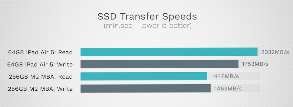 MacBook Air รุ่น 15 นิ้ว รุ่นเริ่มต้นมาพร้อม SSD ความจุ 256GB และจากการทดสอบของ Max Tech พบว่า ตัวเลือกเริ่มต้นทำงานช้ากว่า เมื่อเทียบกับตัวเลือกความจุ 512GB, 1TB และ 2TB