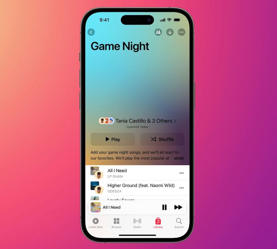 หนึ่งในฟีเจอร์ที่ผู้ใช้ Apple Music เรียกร้องมากที่สุด และ Spotify ก็มีฟีเจอร์ที่คล้ายกันให้ใช้งานแล้ว โดยฟีเจอร์ Collaborative Playlists ช่วยให้สมาชิก Apple Music สามารถสร้าง Playlists และเชิญให้เพื่อนๆ สามารถเข้ามาแก้ไข Playlists เดียวกันได้ ซึ่งใครที่เข้ามาแก้ไข Playlists ก็จะแสดงรูปโปรไฟล์กำกับไว้ด้านข้างแทร็ก อีกทั้งยังสามารถใช้อีโมจิเพื่อโต้ตอบกับเพลงใน Playlists ได้ด้วย