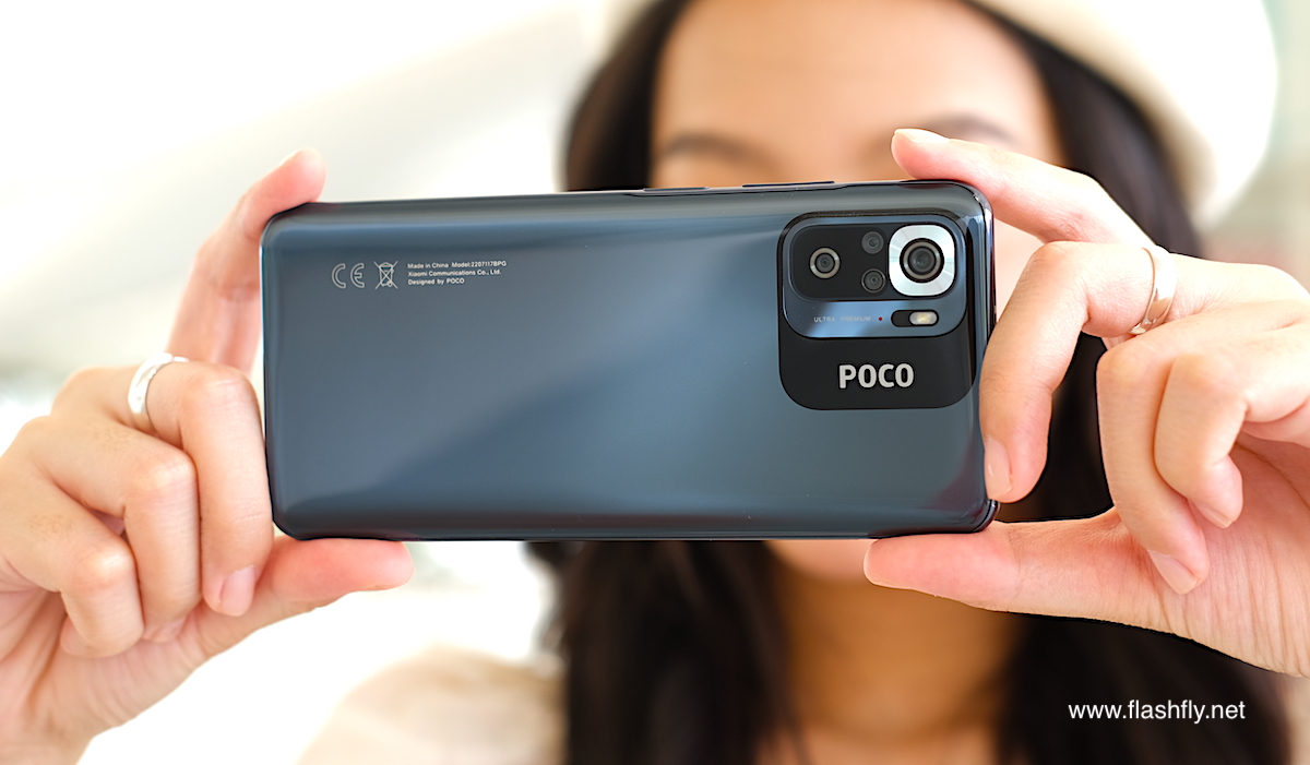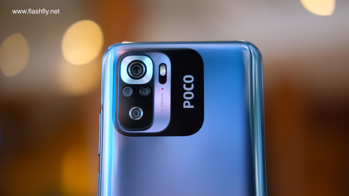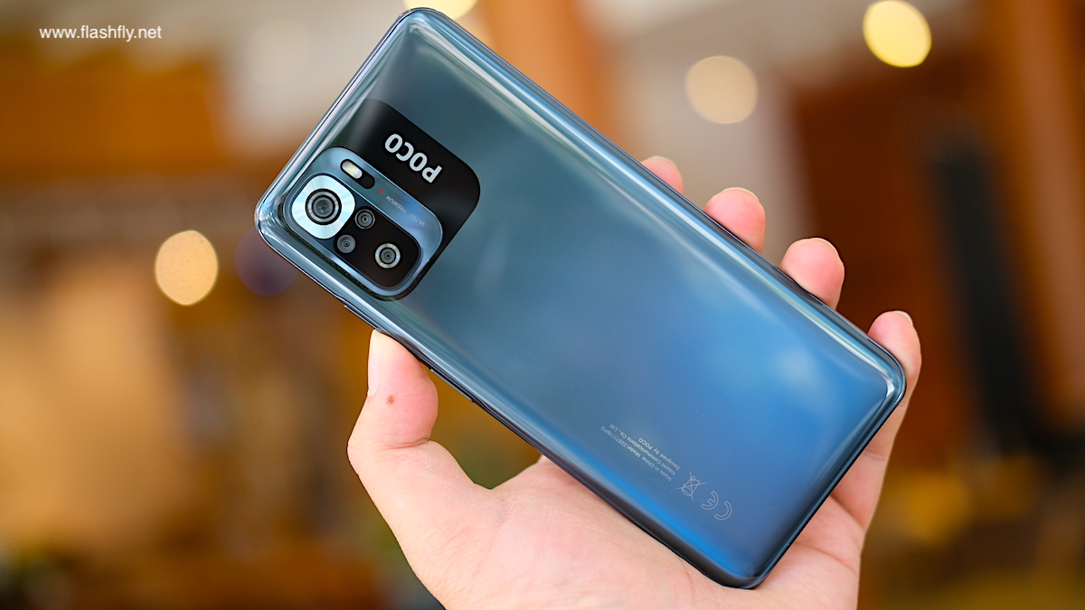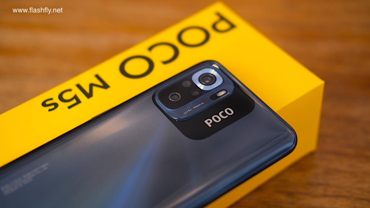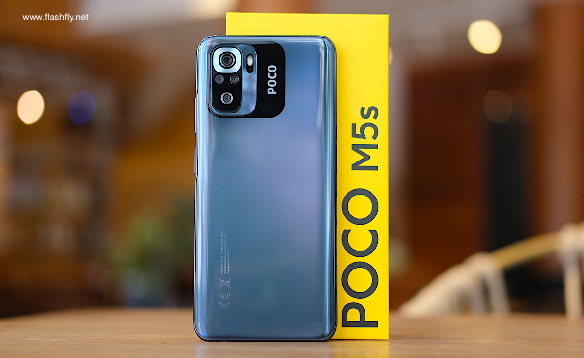 POCO M5s ผลิตออกมาให้เลือก 4 สี ได้แก่ สีเทา, สีขาว, สีน้ำเงิน และ สีเหลือง แต่รุ่นอัปเกรดความจำ RAM 8GB + ROM 256GB ที่ทีมงาน @Flashfly ได้รับมารีวิว มีให้เลือกเฉพาะสีเทา ซึ่งเป็นโทนสีกลางๆ เหมาะสำหรับทุกเพศทุกวัย ฝาหลังของ POCO M5s มีความมันวาว ทำให้ดูคล้ายใช้วัสดุกระจก ส่งผลให้ดีไซน์โดยรวมมีความสวยงามดูพรีเมียม และยังติดตั้งกล้องหลังมาให้ถึง 4 ตัว ซึ่งหาได้ยากแล้วในเซกเมนต์เดียวกัน