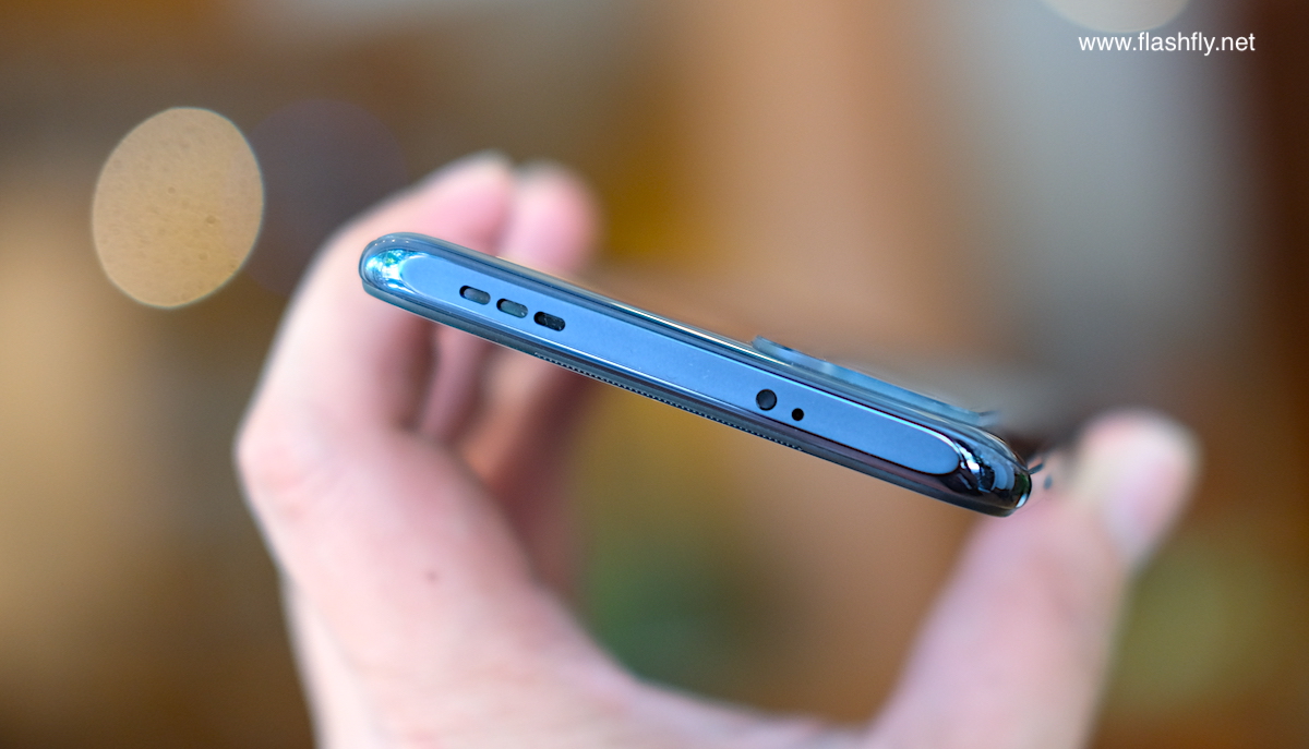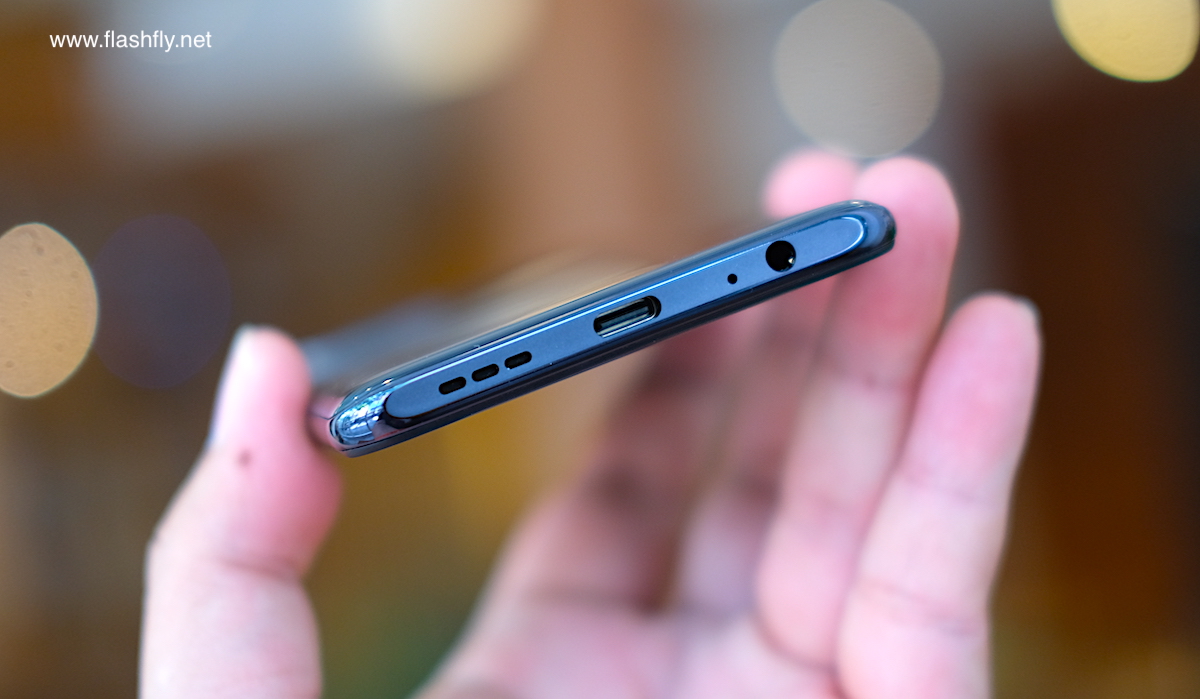 ด้านล่าง ประกอบด้วย ช่องเสียบหูฟัง 3.5 มิลลิเมตร, ไมโครโฟนตัวหลัก, พอร์ตเชื่อมต่อ USB Typle-C และ ลำโพงตัวหลัก ให้เสียงเซอร์ราวด์แบบสเตอริโอ เมื่อขับเสียงร่วมกับลำโพงด้านบน