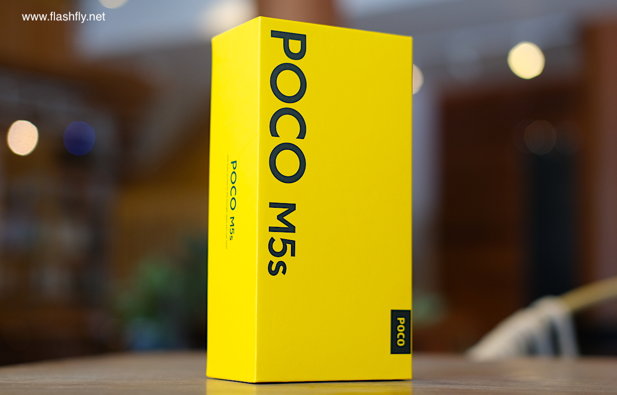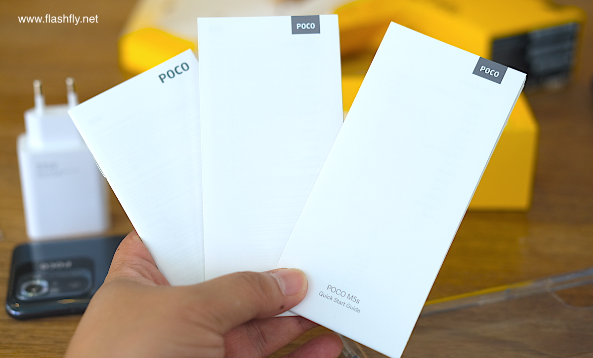 POCO M5s ถูกจัดส่งมาในกล่องสีเหลืองเรียบๆ ไม่มีลวดลายใดๆ หน้ากล่องพิมพ์ชื่อรุ่น POCO M5s ขนาดใหญ่ชัดเจน ภายในกล่องจะพบกับสมาร์ทโฟนเป็นอย่างแรก วางทับซองเอกสารที่แนบเข็มจิ้มช่องใส่ซิมการ์ดมาให้ด้วย ภายในซองแถมเคสใสมาให้ 1 อัน, ฟิล์มกันรอย, คู่มือ, ข้อมูลความปลอดภัย รวมถึงใบรับประกัน นอกจากนี้ ยังแถมสายชาร์จ และหัวชาร์จ 33W Power Adapter ถือว่าให้อุปกรณ์มาครบครัน แต่ฟิล์มกันรอยไม่ได้ติดมาให้จากโรงงาน