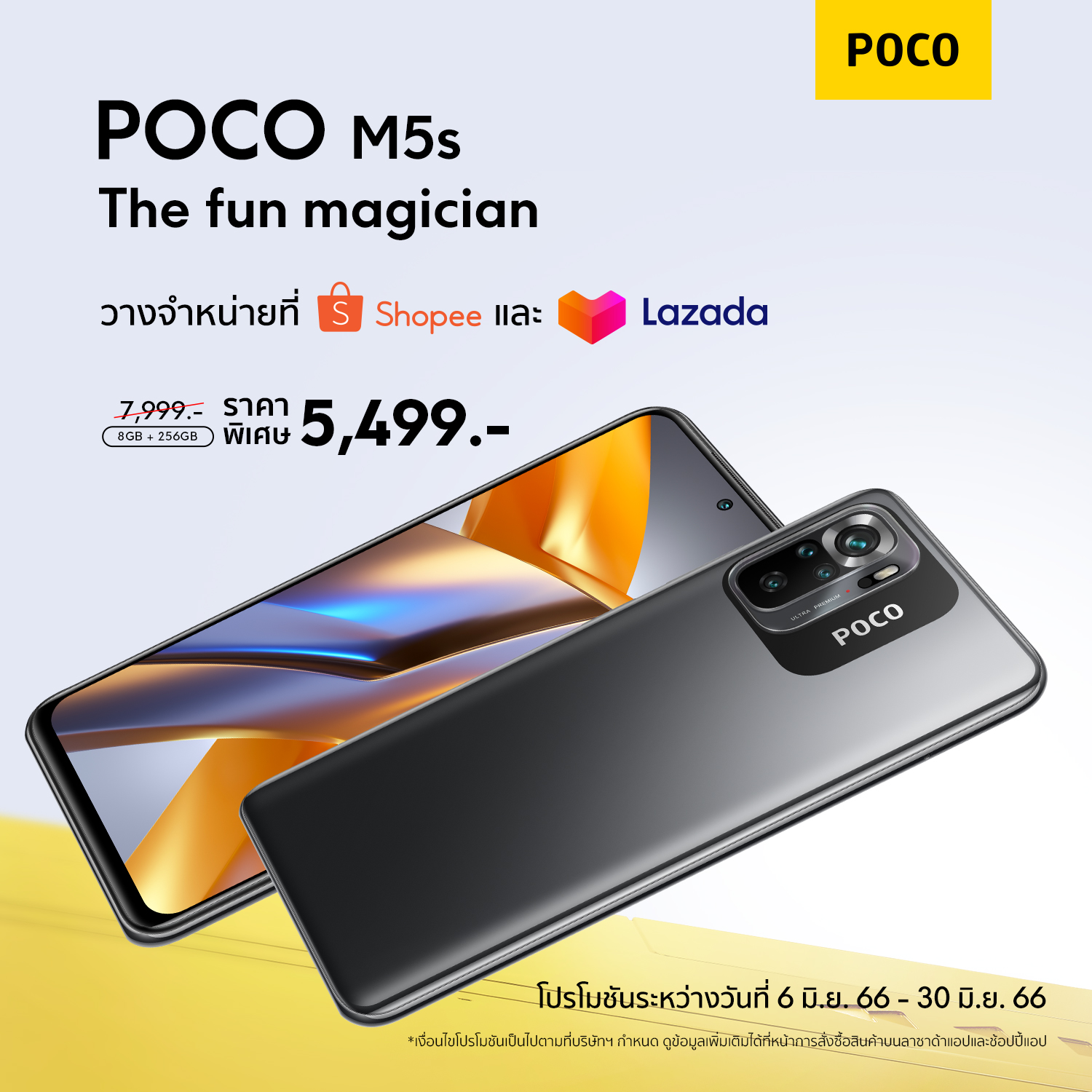 ทั้งนี้ POCO M5s รุ่นความจุ RAM 8GB + ROM 256GB พร้อมวางจำหน่ายในไทยแล้ว ราคาเพียง 5,499 บาท (จากราคาปกติ 7,999 บาท) ซึ่งเป็นโปรโมชันพิเศษช่วงแนะนำ ระหว่างวันที่ 6 – 30 มิถุนายน 2566 เท่านั้น จับจองได้ผ่านแพลตฟอร์มร้าานค้าออนไลน์ Shopee และ Lazada