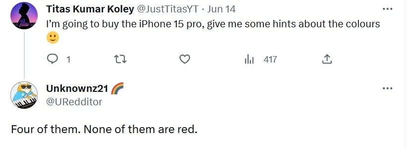 Unknownz21 ตอบคำถามผู้ติดตามที่อยากทราบเกี่ยวกับสีสันของ iPhone 15 Pro โดยบอกว่า iPhone 15 Pro จะมีให้เลือก 4 สี แต่ไม่มีสีแดง