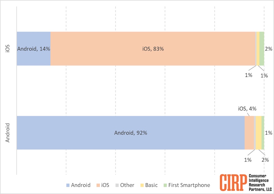 เดือนที่ผ่านมา CIRP (Consumer Intelligence Research Partners) เคยรายงานว่า ผู้ใช้ Android เปลี่ยนมาใช้ iPhone สูงสุดในรอบ 5 ปี และล่าสุดได้ออกมาเปิดตัวตัวเลขให้ชัดเจนมากขึ้น แต่เป็นการสำรวจข้อมูลเฉพาะในสหรัฐอเมริกา