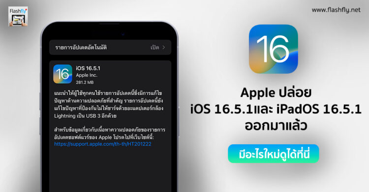 วันนี้ Apple ได้ปล่อยอัปเดต iOS 16.5.1 และ iPadOS 15.6.1 เวอร์ชั่นล่าสุดออกมา แนะนำให้ผู้ใช้ทุกคนใช้รายการอัปเดตนี้ซึ่งมีการแก้ไขปัญหาด้านความปลอดภัยที่สำคัญ รายการอัปเดตนี้ยังแก้ไขปัญหาที่ป้องกันไม่ให้ชาร์จด้วยอะแดปเตอร์กล้อง Lightning เป็น USB 3 อีกด้วย