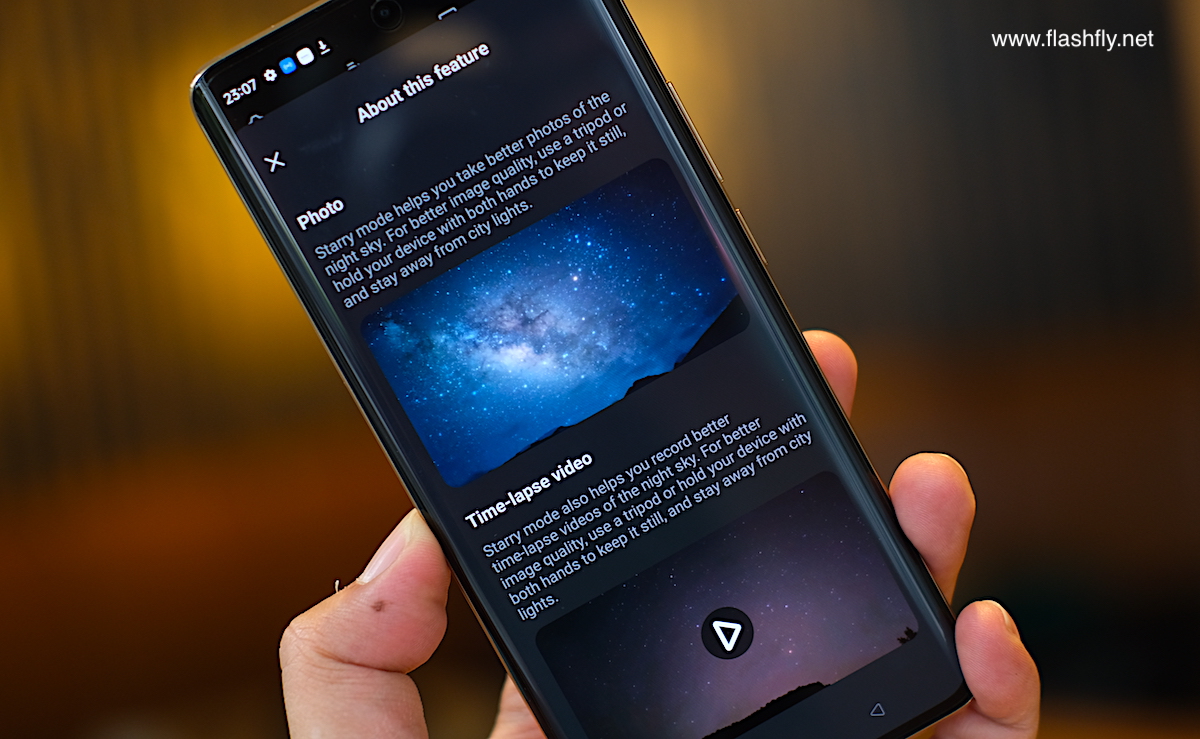 โหมด Handheld Starry Sky เป็นอีกโหมดการถ่ายภาพที่ realme รองรับเป็นครั้งแรก ช่วยให้ผู้ใช้งานสามารถถ่ายภาพท้องฟ้าที่เต็มไปด้วยดวงดาว โดยไม่ต้องตั้งค่าที่ซับซ้อน และไม่จำเป็นต้องใช้ขาตั้งกล้อง โดยอาศัยการทำงานร่วมกันระหว่างอัลกอริทึม First StarLight, เทคโนโลยี Super OIS, การลดสัญญาณรบกวนแบบหลายเฟรมของ AI และ อัลกอริทึมการจัดตำแหน่งดาว ทำให้ realme 11 Pro+ 5G สามารถถ่ายภาพท้องฟ้าที่เต็มไปด้วยดวงดาวที่สว่างและชัดเจนผ่านการปรับค่าแสงแบบไดนามิก