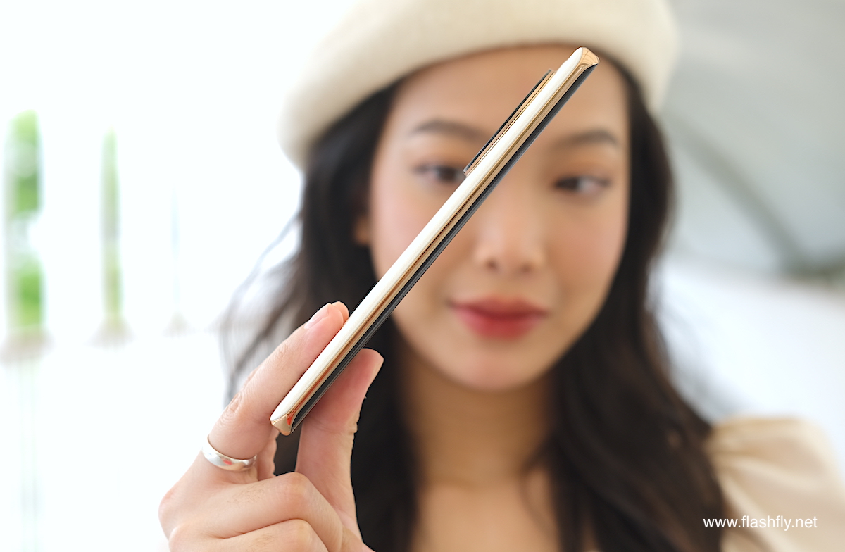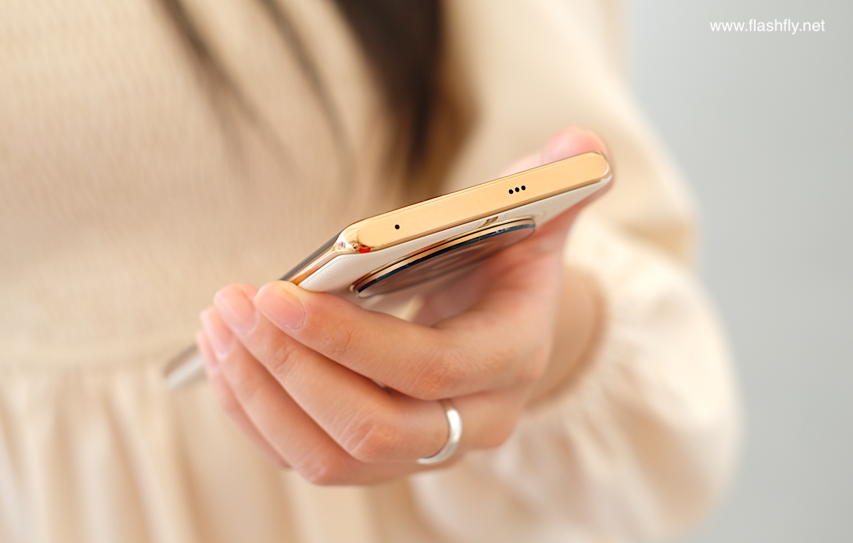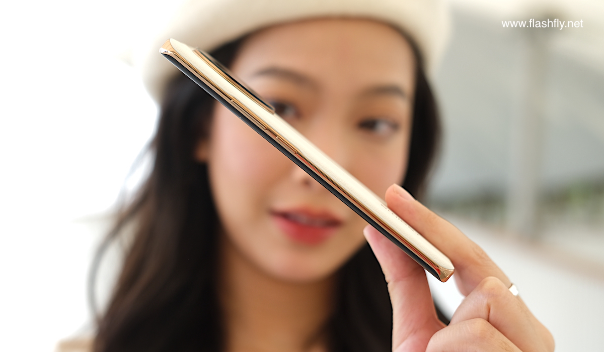 ส่วนขอบด้านข้างมีความบาง 8.2 มิลลิเมตร สำหรับสี Astral Black แต่ถ้าเป็นสี Sunrise Beige กับ Oasis Green จะมีความบาง 8.7 มิลลิเมตร เนื่องจากฝาหลังถูกหุ้มด้วย Premium Lychee Vegan Leather