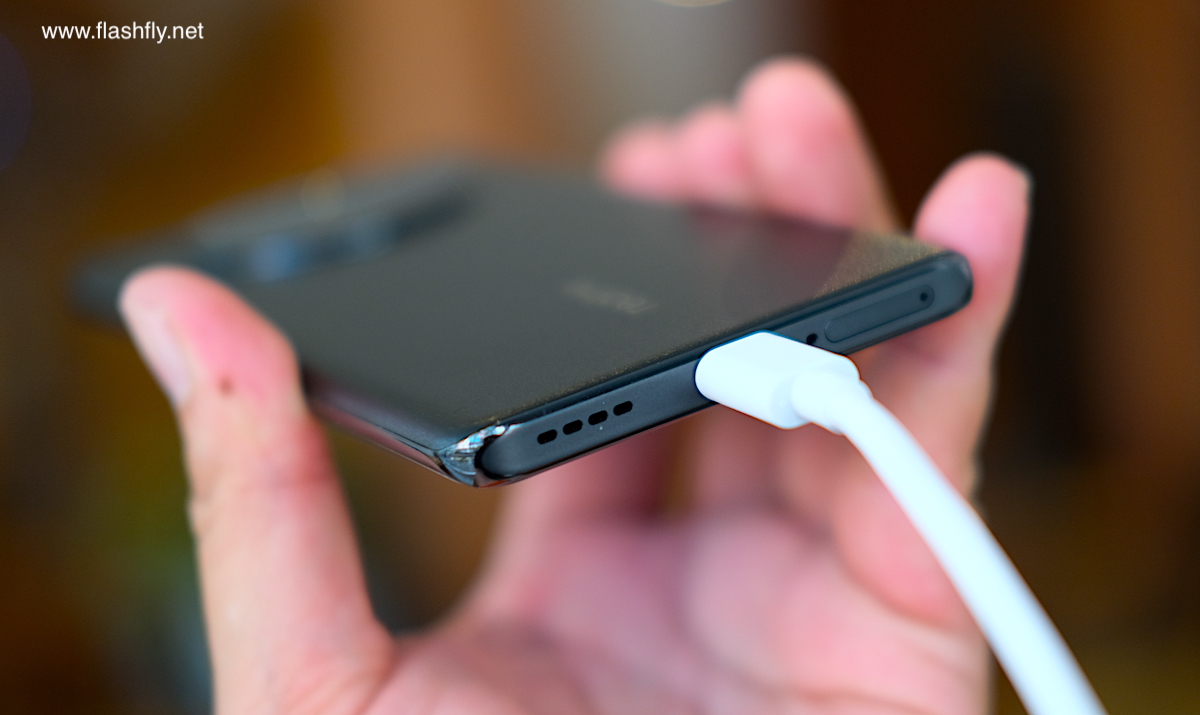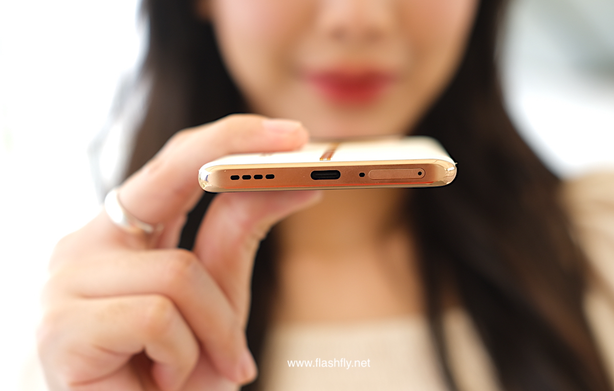 ด้านล่างมีลำโพงสเตอริโอ (ขับเสียงร่วมกับลำโพงด้านบน), พอร์ตเชื่อมต่อ USB Type-C, ไมโครโฟนตัวหลัก และ ถาดใส่ซิมการ์ด รองรับ 2 ซิม (Dual Nano-SIM)