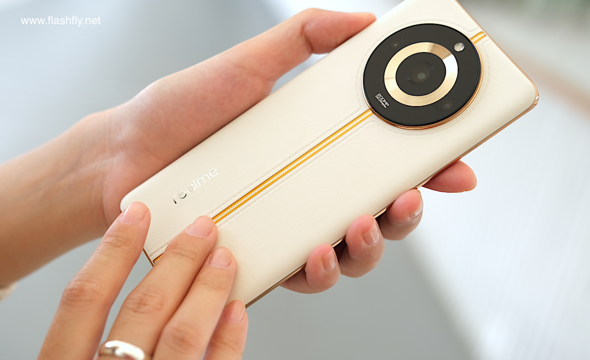 realme 11 Pro Series 5G สี Sunrise Beige (รวมถึงสี Oasis Green) มีฝาหลังที่หรูหราพรีเมียมด้วยการหุ้มหนังวีแกนลายผลลิ้นจี่ (Premium Lychee Vegan Leather) ผ่านกรรมวิธีการผลิตระดับพรีเมียม เพิ่มรายละเอียดแนวตะเข็บแบบ 3 มิติ ที่สวยงามตามแบบฉบับของช่างฝีมือ ผสานการทอแบบ 3 มิติ เพื่อสร้างสรรค์ดีไซน์ที่งดงาม ทันสมัย สะกดทุกสายตา