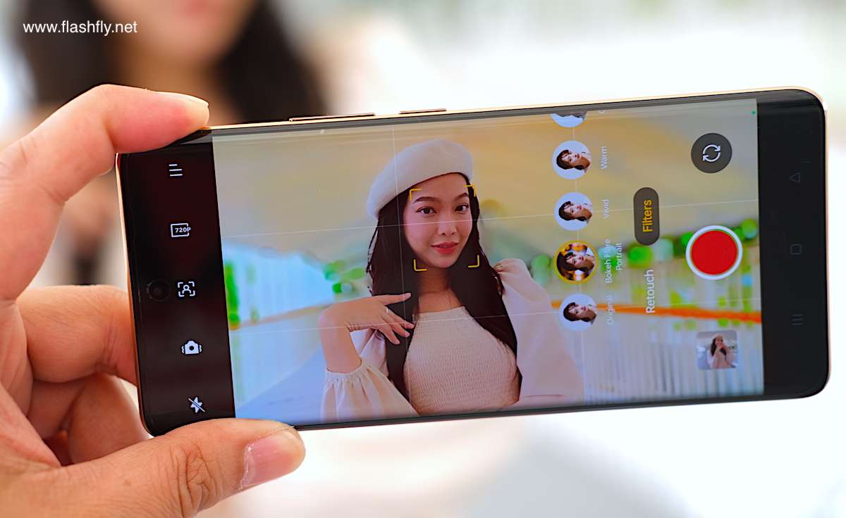 กล้องหน้ามีความละเอียด 32 ล้านพิกเซล ใช้เซ็นเซอร์ Sony IMX615 ให้มุมมองกว้าง 90 องศา ช่วยเก็บภาพฉากหลังที่เป็นวิวสวยๆ ได้มากขึ้น โดยโหมด Photo ของกล้องหน้า สามารถปรับระยะการซูมได้ 2 ระดับ ได้แก่ 0.8x และ 1x มาพร้อมฟีเจอร์ Retouch สำหรับปรับความงามบนใบหน้าได้หลายส่วน ที่สำคัญคือมีอัลกอริทึมกำจัดฝ้าของ AI ที่ได้รับการปรับปรุงใหม่ สามารถรักษาโทนสีผิวที่สม่ำเสมอของเลนส์ด้านหน้า สามารถปรับผิวพรรณของใบหน้าให้สวยงามราวกับผิวเด็ก ให้ความรู้สึกเหมือนผิวจริงจากธรรมชาติ