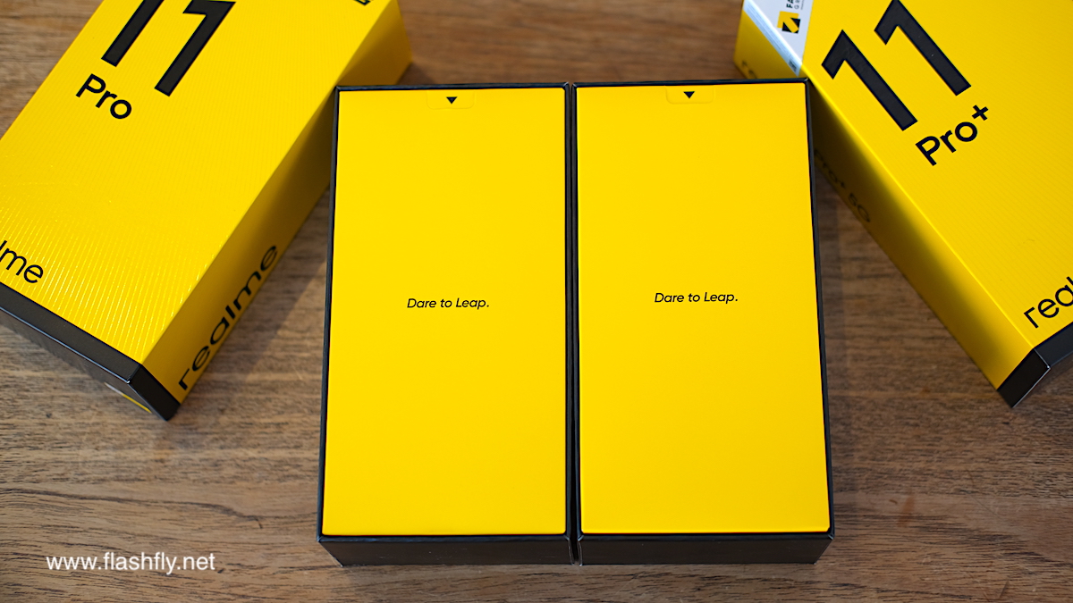 realme 11 Pro+ 5G และ realme 11 Pro 5G ถูกจัดส่งมาในกล่องสีเหลืองตามสไตล์ realme หน้ากล่องของทั้งคู่ก็ดูเหมือนกัน โดดเด่นด้วยเลข 11 ขนาดใหญ่ แต่จะเห็นความแตกต่างได้อย่างชัดเจนจากชื่อรุ่น Pro+ และ Pro ที่อยู่ใต้เลข 11 ขณะที่หลังกล่องบอกจุดเด่นที่น่าสนใจของทั้ง 2 รุ่น รวมถึงติดฉลากที่ระบุรหัสรุ่น, สีสัน, หมายเลขอีมี่, ชื่อรุ่น, เครือข่ายที่รองรับ และข้อมูลต่างๆ ที่เกี่ยวข้องกับการผลิต