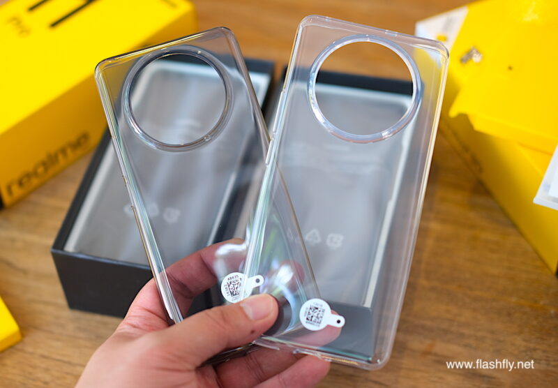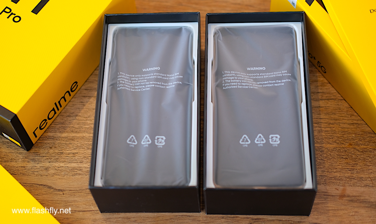 ใต้กล่องเอกสาร เป็นชั้นวางสมาร์ตโฟน ซึ่งถูกห่อหุ้มอยู่ในซองอย่างดี เมื่อหยิบสมาร์ตโฟนออกมาจากซอง จะพบว่า realme 11 Pro+ 5G และ realme 11 Pro 5G ได้รับการติดฟิล์มป้องกันรอยหน้าจอมาให้แล้ว