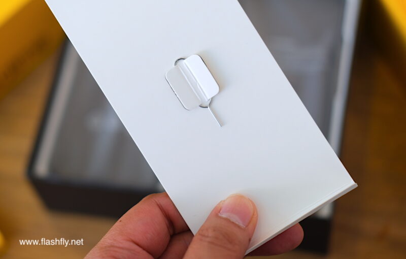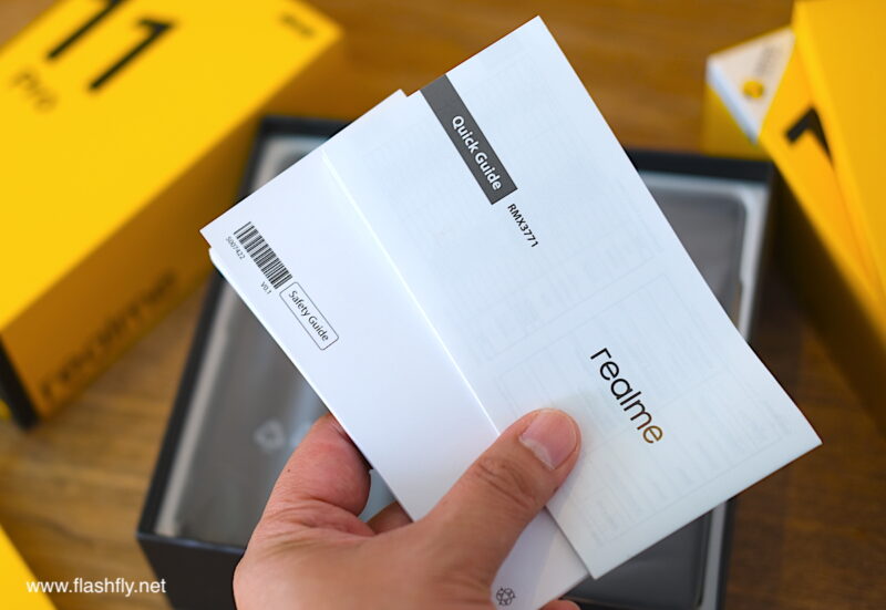เมื่อยกฝากล่องขึ้นมา จะเห็นว่าตัวกล่องจริงๆ เป็นสีดำ โดยมีกล่องเอกสารสีเหลืองแบนๆ วางอยู่บนสุด ภายในมีคู่มือ Quick Guide, ข้อมูลด้านความปลอดภัย (รวมถึงใบรับประกัน), เข็มช่วยถอดช่องใส่ซิมการ์ด และแถมเคสมาให้ 1 อัน (realme 11 Pro+ 5G ได้เคสใส ส่วน realme 11 Pro 5G ได้สีดำโปร่งใส)