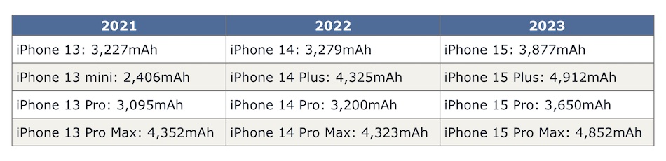 ถ้าหากรายงานนี้มีความถูกต้อง หมายความว่า iPhone 15 จะมีแบตเตอรี่ใหญ่ขึ้น 18%, iPhone 15 Plus และ iPhone 15 Pro จะมีแบตเตอรี่ใหญ่ขึ้น 14% และ iPhone 15 Pro Max จะมีแบตเตอรี่ใหญ่ขึ้น 12%