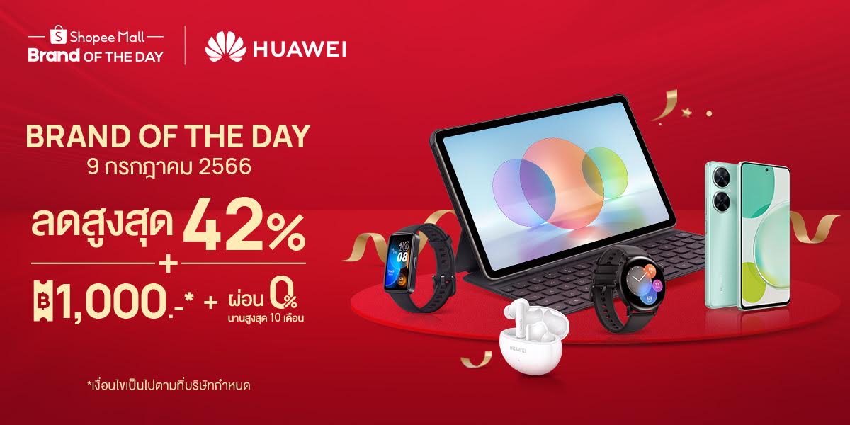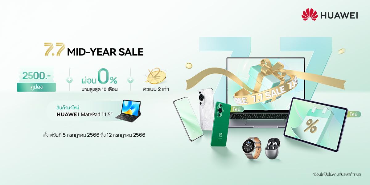 หัวเว่ย คอนซูมเมอร์ บิสสิเนส กรุ๊ป (ประเทศไทย) จัดโปรโมชันออนไลน์ “7.7 MID-YEAR SALE” มอบส่วนลดสูงสุดถึง 42% และคูปองส่วนลดมูลค่าสูงสุด 2,500 บาท กับขบวนสินค้าหัวเว่ยไม่ว่าจะเป็นแล็ปท็อป แท็บเล็ต สมาร์ทโฟน สมาร์ทวอทช์ สมาร์ทแบนด์ และหูฟัง ตั้งแต่ตั้งแต่วันที่ 5 กรกฎาคม 2566 ถึง 8 กรกฎาคม 2566 ที่เว็บไซต์ HUAWEI Store รวมถึงที่ร้านค้าอย่างเป็นการของหัวเว่ยบน Shopee และ Lazada