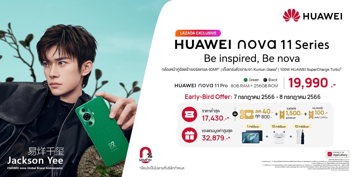 - HUAWEI nova 11 Pro สมาร์ทโฟนกล้องหน้าคู่แบบอัลตร้าพอร์ตเทรต 60 ล้านพิกเซล มั่นใจทุกการใช้งานด้วยกระจกแข็งแกร่ง Kunlun Glass เต็มสปีดรวดเร็วทันใจกับการชาร์จไว 100W HUAWEI SuperCharge Turbo ในราคาเพียง 19,990 บาท สั่งซื้อได้ที่เว็บไซต์ HUAWEI Store และเฉพาะร้านค้าอย่างเป็นทางการของหัวเว่ยบน Lazada รับฟรีของแถมมูลค่ารวมสูงถึง 32,879 บาท (เฉพาะคำสั่งซื้อแรกเท่านั้น)