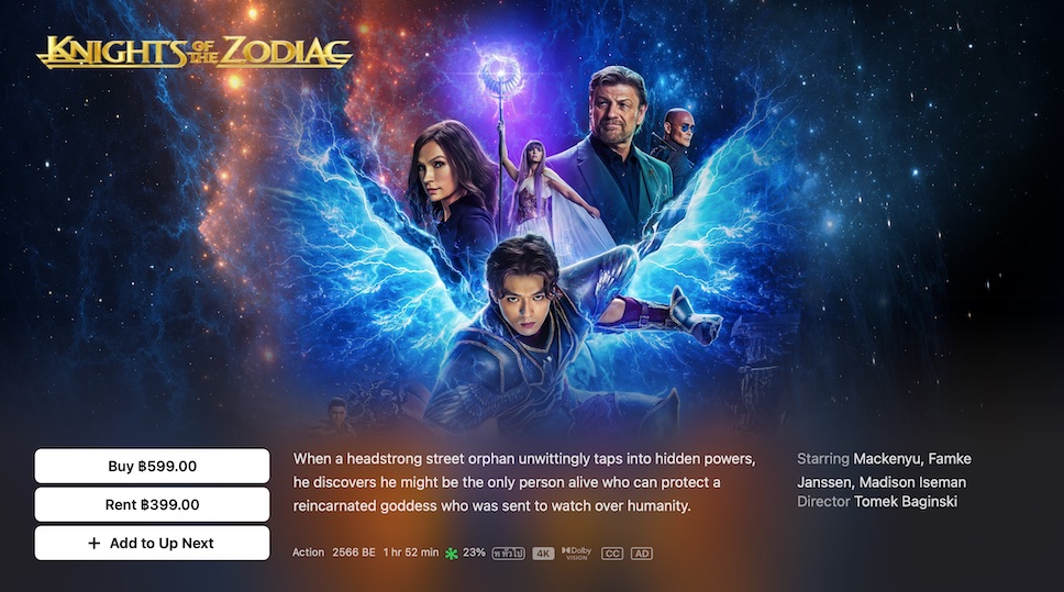 ภาพยนตร์ Knights of the Zodiac ฉบับ Live Action ดัดแปลงมาจากซีรีส์อนิเมะของ Toei Animation พร้อมวางจำหน่ายแล้วบนแอปพลิเคชัน Apple TV ในราคา 599 บาท ขณะที่ ภาพยนตร์แอนิเมชั่น The Super Mario Bros. Movie วางจำหน่ายในราคา 499 บาท