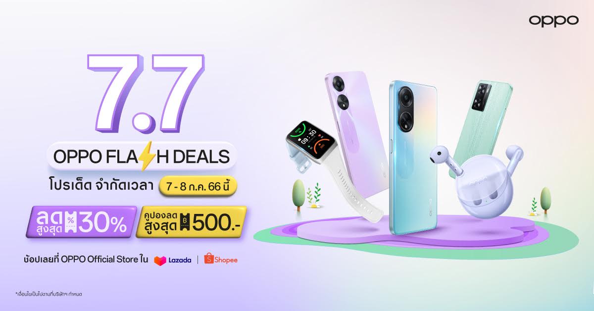 OPPO แบรนด์เทคโนโลยีชั้นนำระดับโลก จัดโปรแรง ลดสุดคุ้มรับเดือนกรกฎาคม ผ่านแคมเปญ “OPPO 7.7 Flash Deals” จัดเต็มส่วนลดสมาร์ตโฟนและอุปกรณ์ IoT สูงสุด 30% และคูปองลดสูงสุด 500 บาท พร้อมของรางวัลมากมายมูลค่ารวมกว่า 147,567 บาท เริ่มวันที่ 7-8 กรกฏาคม 2566 นี้ ที่ OPPO Official Store บน Shopee และ Lazada