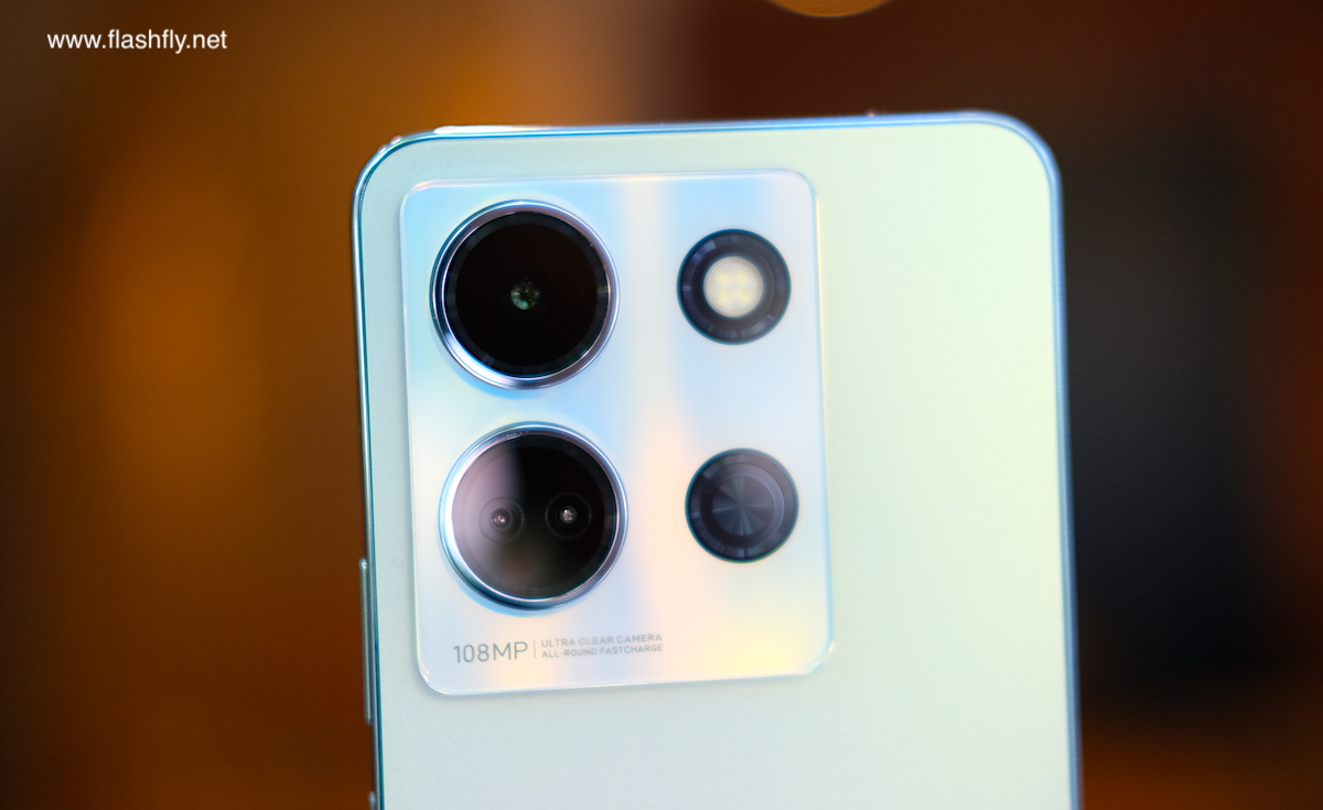 Infinix NOTE 30 5G ได้รับกล้องหลัง 3 ตัว โดยกล้องหลักความละเอียดสูง 108 ล้านพิกเซล ถูกติดตั้งอยู่ในกรอบวงแหวนด้านบน ขณะที่กล้องอีก 2 ตัว ถูกรวมไว้ในกรอบวงแหวนด้านล่าง และข้างกล้องหลักเป็นตำแหน่งไฟแฟลช LED แบบ 4 ดวง