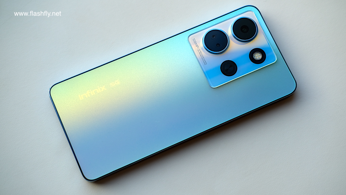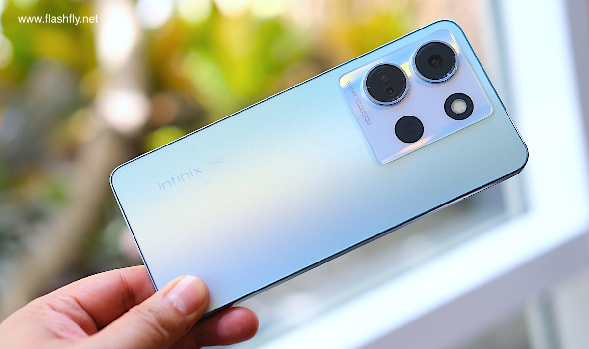 Infinix NOTE 30 5G ได้รับการออกแบบมาอย่างสวยหรูพรีเมียม ใช้วัสดุแข็งแรงทนทาน จับถนัดมือ มีให้เลือก 2 สี ได้แก่ สีดำ Magic Black และ สีฟ้า Interstellar Blue ซึ่งเป็นตัวเลือกที่ทีมงาน @Flashfly ได้รับมารีวิว มีเอฟเฟกต์ไล่ระดับสีบนแผงหลังเพิ่มความโดดเด่น