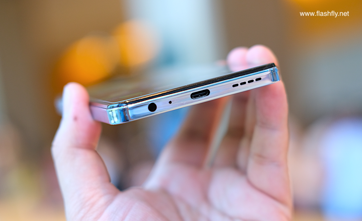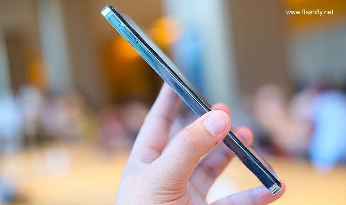 ขอบด้านข้างเรียบแบน มีความบาง 8.45 มิลลิเมตร พบถาดใส่ซิมการ์ด รองรับ 2 ซิม Dual Nano-SIM และมีช่องใส่การ์ด microSD สนับสนุนความจุสูงสุด 2TB