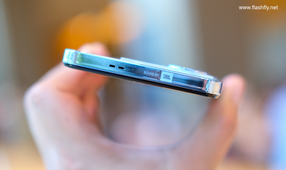 ด้านบนมีลำโพงตัวที่ 2 ให้เสียงสเตอริโอ (เมื่อขับเสียงร่วมกับลำโพงด้านล่าง) พร้อมด้วยโลโก้ Sound by JBL ที่ช่วยปรับแต่งเสียง และยังสนับสนุนไฟล์เสียงคุณภาพสูงระดับ Hi-Res Audio