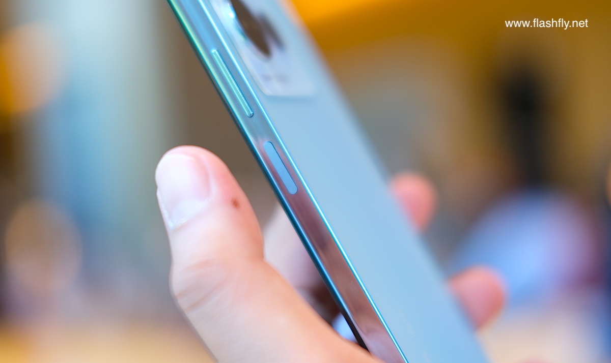 อีกข้างมีปุ่มปรับระดับเสียง ถัดลงมาเป็นปุ่มเพาเวอร์ ที่มีการติดตั้งเซ็นเซอร์สแกนลายนิ้วมือรวมไว้ด้วย