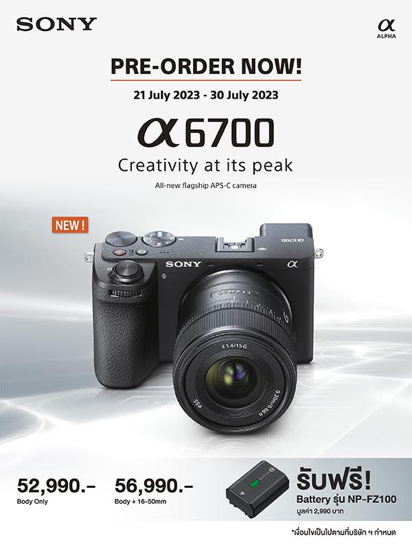 บริษัท โซนี่ ไทย จำกัด เปิดตัวกล้องมิเรอร์เลส APS-C รุ่นใหม่ล่าสุด α6700 ที่รวมความสามารถในการถ่ายภาพนิ่งและวิดีโออันล้ำสมัยที่พบในกล้องตระกูล Alpha Series และ Cinema Line รุ่นล่าสุดเข้ากับการออกแบบที่กะทัดรัดและน้ำหนักเบาของกล้องในตระกูล α6000 Series โดยมาพร้อมเซ็นเซอร์ภาพ Back-illuminated APS-C Exmor R™ CMOS ด้วยความละเอียด 26.0 ล้านพิกเซล ผสานการทำงานร่วมกับความเร็วของระบบประมวลผลอันทรงพลังอย่าง BIONZ XR™ ของโซนี่ ทำให้กล้องมิเรอร์เลส α6700 สามารถมอบประสิทธิภาพการถ่ายภาพที่ยอดเยี่ยม ทั้งยังรองรับการบันทึกวิดีโอที่มีความละเอียด 4K ที่ความเร็วสูงสุด 120 เฟรมต่อวินาที1 และละติจูดกว้างถึง 14+ สต็อป2 สำหรับเก็บรายละเอียดในสภาพแสงจ้า อีกทั้งยังมาพร้อมคุณสมบัติโปร์ไฟล์ภาพ S-Cinetone ที่พบในกล้องตระกูล Cinema Line ซึ่งเป็นกล้องถ่ายภาพยนตร์ระดับมืออาชีพของโซนี่ ที่จะช่วยในการปรับแต่งภาพจากภาพยนตร์ที่ไม่ต้องการการจัดระดับสีและให้การแสดงโทนสีผิวของมนุษย์ได้อย่างน่าอัศจรรย์ พร้อมเปิดให้ผู้สนใจสามารถสั่งจองได้ตั้งแต่วันที่ 21 กรกฏาคม 2566 ถึง 30 กรกฏาคม 2566 ในราคา 52,990 บาท สำหรับบอดี้อย่างเดียว และ ราคา 56,990 บาท สำหรับบอดี้ + เลนส์ SELP1650 (16-50mm) สำหรับผู้ที่จองในช่วงเวลาดังกล่าว จะได้รับของแถมเป็น Battery รุ่น NP-FZ100 จำนวน 1 ก้อน มูลค่า 2,990 บาท