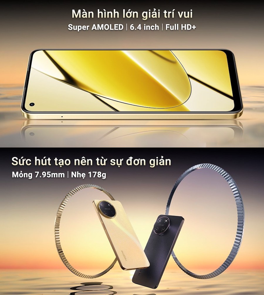 realme 11 4G ถูกลือว่า จะมาพร้อมจอแสดงผล AMOLED ความละเอียด Full HD+ ขนาด 6.4 นิ้ว ให้อัตราการรีเฟรช 90Hz ป้องกันรอบด้วยกระจก Corning Gorilla Glass 5 ตัวเครื่องบาง 7.95 มิลลิเมตร น้ำหนัก 178 กรัม