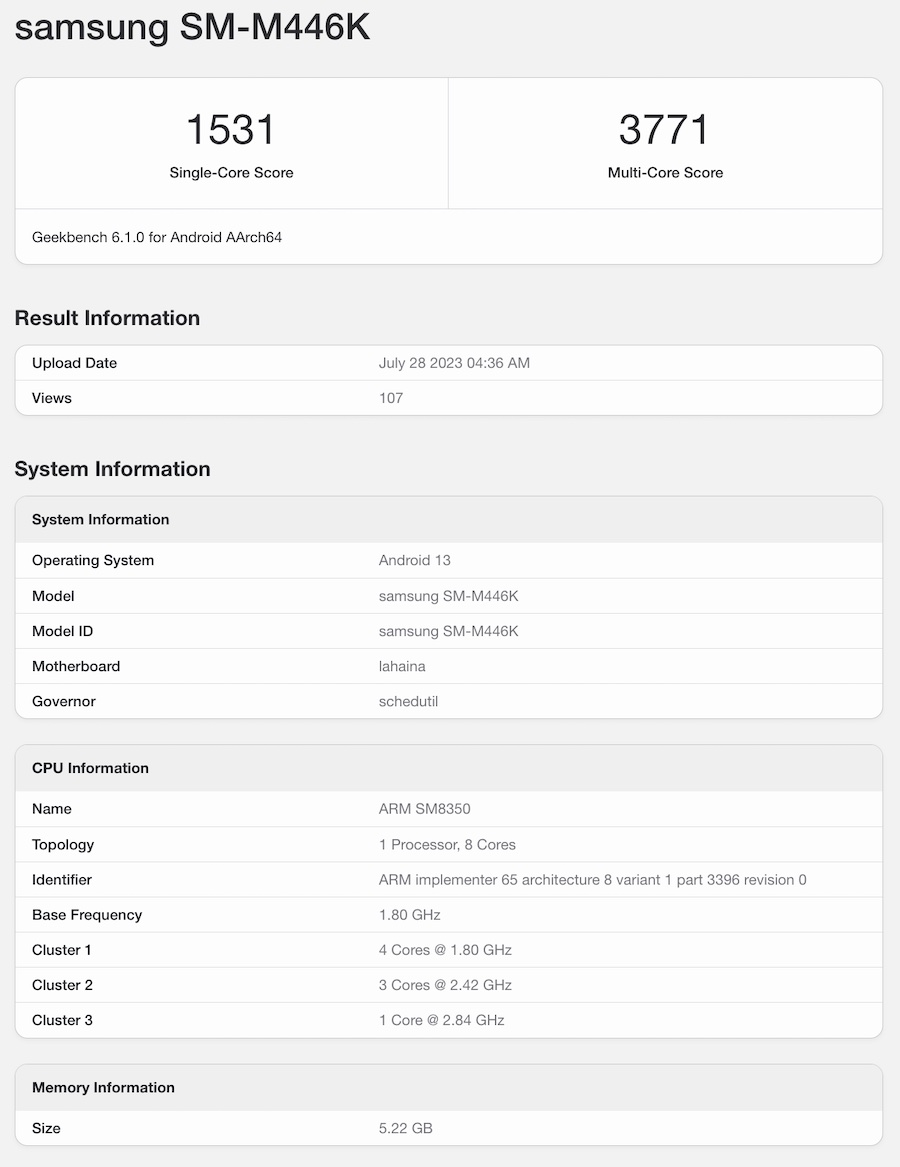 ข้อมูลจากแอป Geekbench ยังระบุว่า Samsung Galaxy M44 5G มีความจำ RAM 6GB ทำงานบนพื้นฐาน Android 13 ทำได้ 1531 คะแนน สำหรับ Single-Core และ 3771 คะแนน สำหรับ Multi-Core