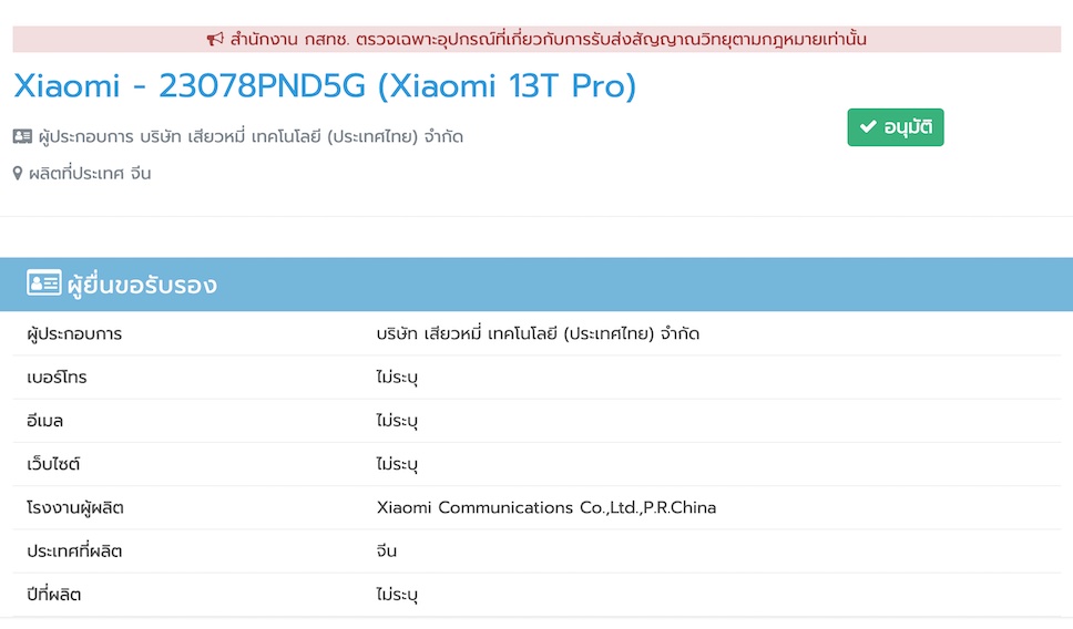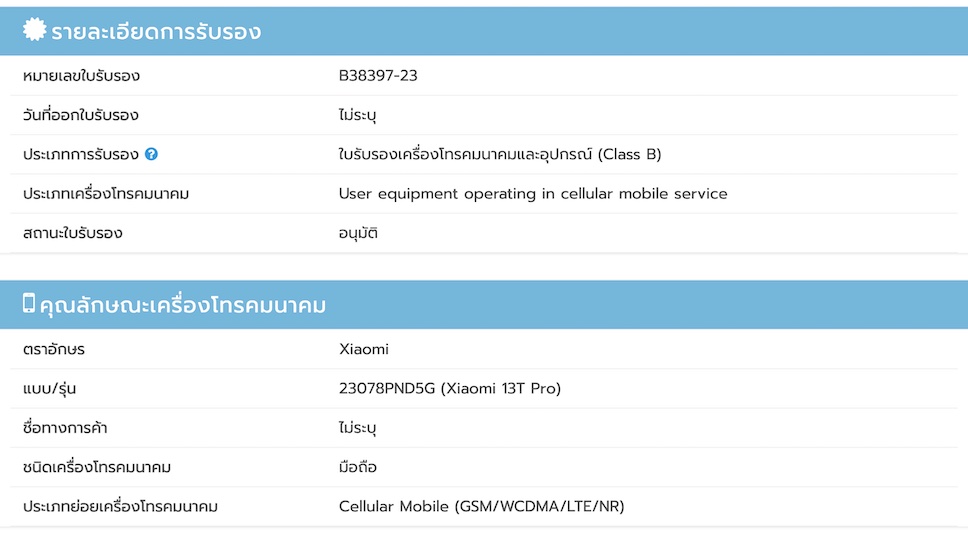 ก่อนหน้านี้ Xiaomi ถูกอ้างว่า มีแผนเปิดตัวสมาร์ทโฟน Xiaomi 13T และ Xiaomi 13T Pro ในวันที่ 1 กันยายนนี้ ซึ่งล่าสุดพบว่า Xiaomi 13T Pro ได้รับการรับรองแล้ว จากสำนักงาน กสทช. ของไทย ซึ่งหมายความว่า กำหนดการเปิดตัวขยับใกล้เข้ามาแล้ว