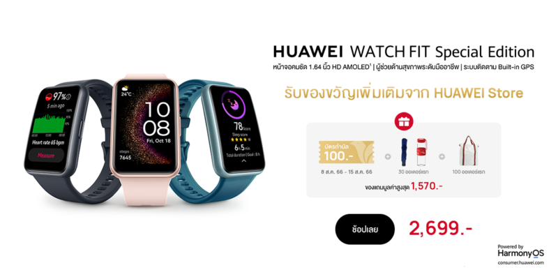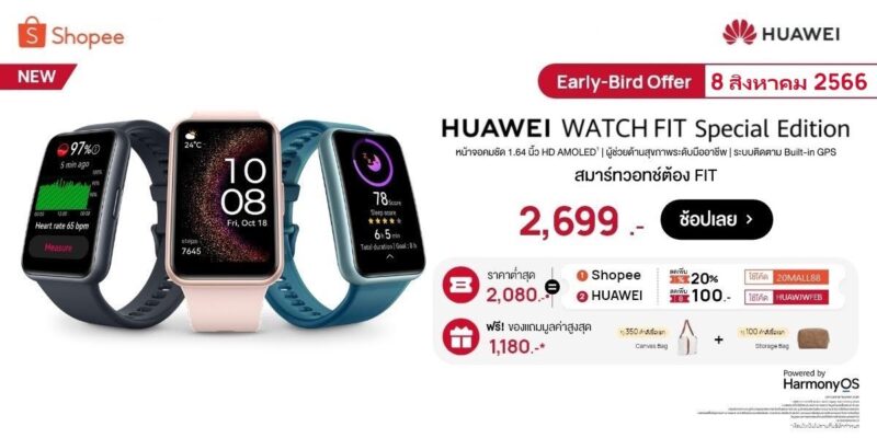 - HUAWEI Store: เมื่อสั่งซื้อ HUAWEI WATCH FIT Special Edition ตั้งแต่วันที่ 8 สิงหาคม 2566 – 15 สิงหาคม 2566 รับคูปองส่วนลด Early Bird 100 บาท พร้อมของแถมสุดพิเศษจำนวนจำกัด ได้แก่กระเป๋าผ้า มูลค่า 790 บาท ร่มมูลค่า 390 บาท และ กระบอกน้ำมูลค่า 390 บาทมูลค่ารวมทั้งหมด 1,570 บาท
