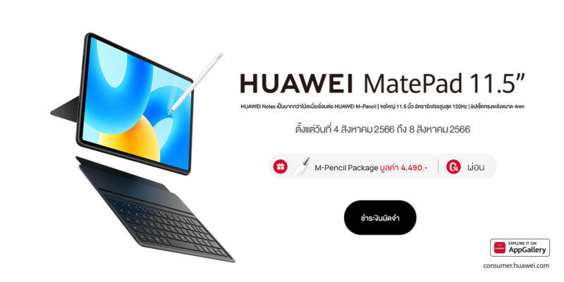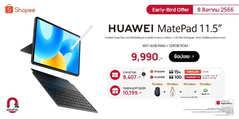 - HUAWEI Store: ช้อป HUAWEI MatePad 11.5 (6GB+128GB) รุ่น WiFi Version ราคา 9,990 บาท ในวันที่ 8 สิงหาคม 2566 รับคูปองสูงสุด 500 บาท และปากกา HUAWEI-M Pencil รุ่นที่ 2 มูลค่า 4,490 บาท