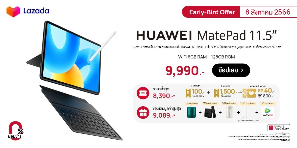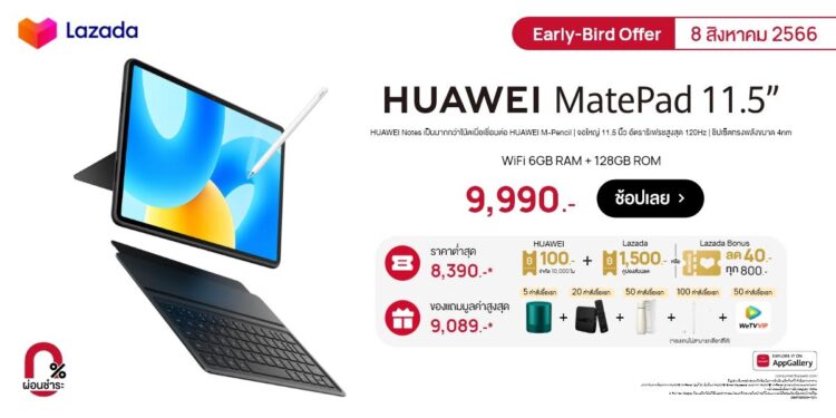 - Lazada: ช้อป HUAWEI MatePad 11.5 (6GB+128GB) รุ่น WiFi Version ในราคาต่ำสุดเพียง 8,390 บาท เมื่อใช้คู่กับคูปองส่วนลดจากหัวเว่ยมูลค่า 100 บาท ร่วมกับคูปองส่วนลดจาก Lazada มูลค่า 1,500 บาท แต่หากพลาดคูปองส่วนลดก็ไม่เป็นไร ยังมีส่วนลดจาก Lazada Bonus ที่ลด 40 บาทเมื่อช้อปทุก 800 บาท นอกจากนี้ลูกค้ายังได้ของแถมอีกมากมายเมื่อซื้อภายในวันที่ 8 สิงหาคม 2566 ได้แก่;